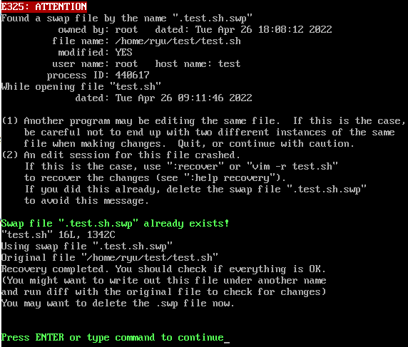 .test.sh.swp 파일이 존재한다라고 떠서 ls -al 로 파일 확인해봅니다.