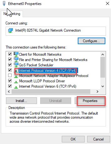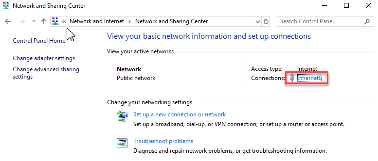 Control Panel > Network and Internet > View network status and tasks > Ethernet